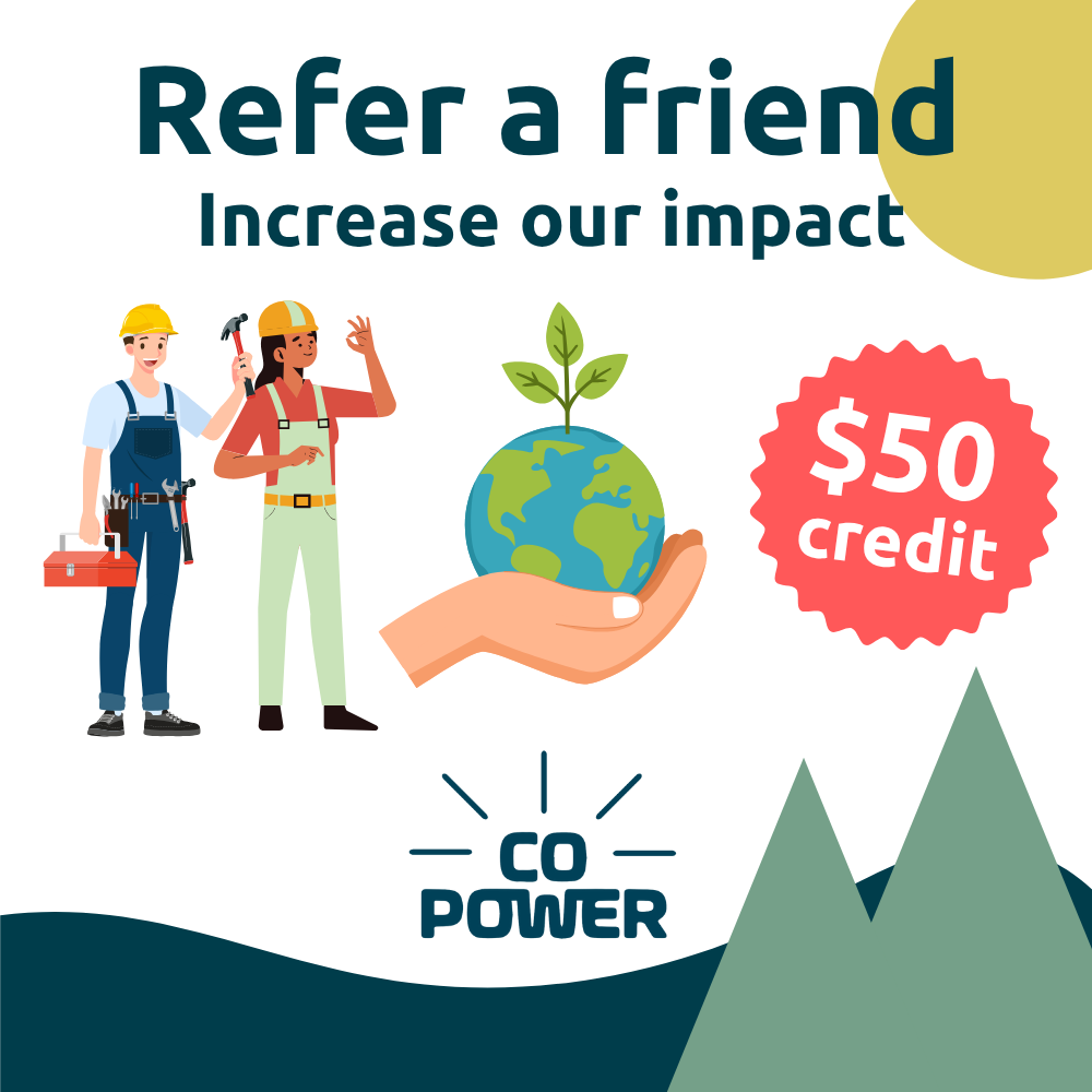 Help us increase our impact by referring a friend or family member to CoPower and you will both receive a $50 solidarity credit on your next bill. Referring a friend is a great way to help your friend get access to fair energy, our exclusive member discounts as well as helping to grow our community.