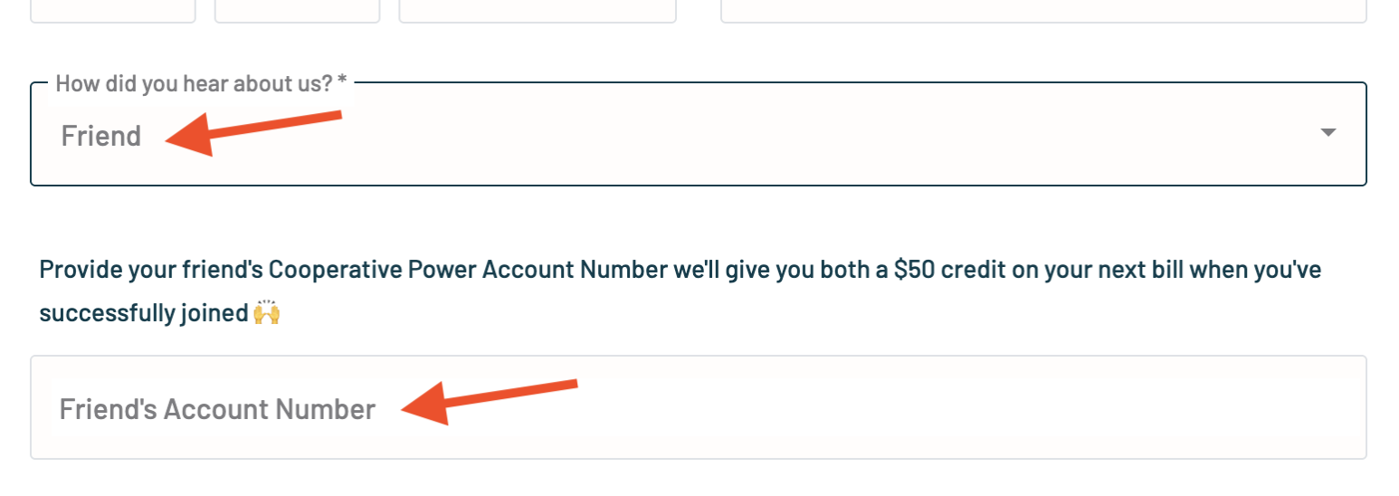 To refer a friend simply send your friend this link or ask them to switch to CoPower using the form on our website. While they are using the form to switch to CoPower, they will arrive at the “How did you hear about us?” field (seen below), ask them to select “Friend” and to enter your account number. This is the 7 digit “Customer Account Number” (starting with number 9) found on the top right of your energy bill